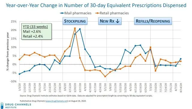 Second, I’m going to bet that enrolling in mail-order pharmacies becomes more common. Frankly, I’m surprised the data suggest that mail order hasn’t actually surged during the pandemic (other than the stockpiling phase). But I feel like Amazon’s recently announced push into mail-order pharmacy is going to spur more initiatives from every mail-order pharmacy player to convert more members to a mail-order pharmacy.