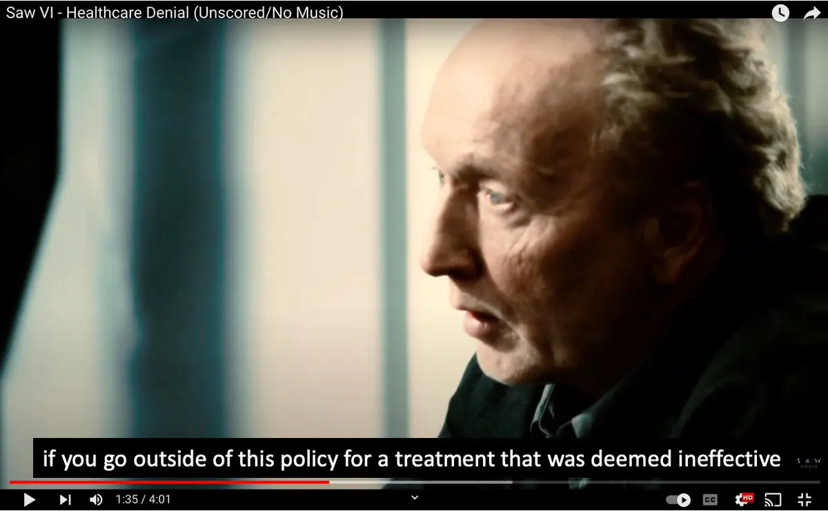 Do yall remember when the plot of Saw 6 was getting revenge on an insurance executive that denied jigsaw treatment (a gene therapy) and then he starts talking about value-based care in far east medicine? The writers for this one definitely switched to a high deductible plan and just needed to air it out.