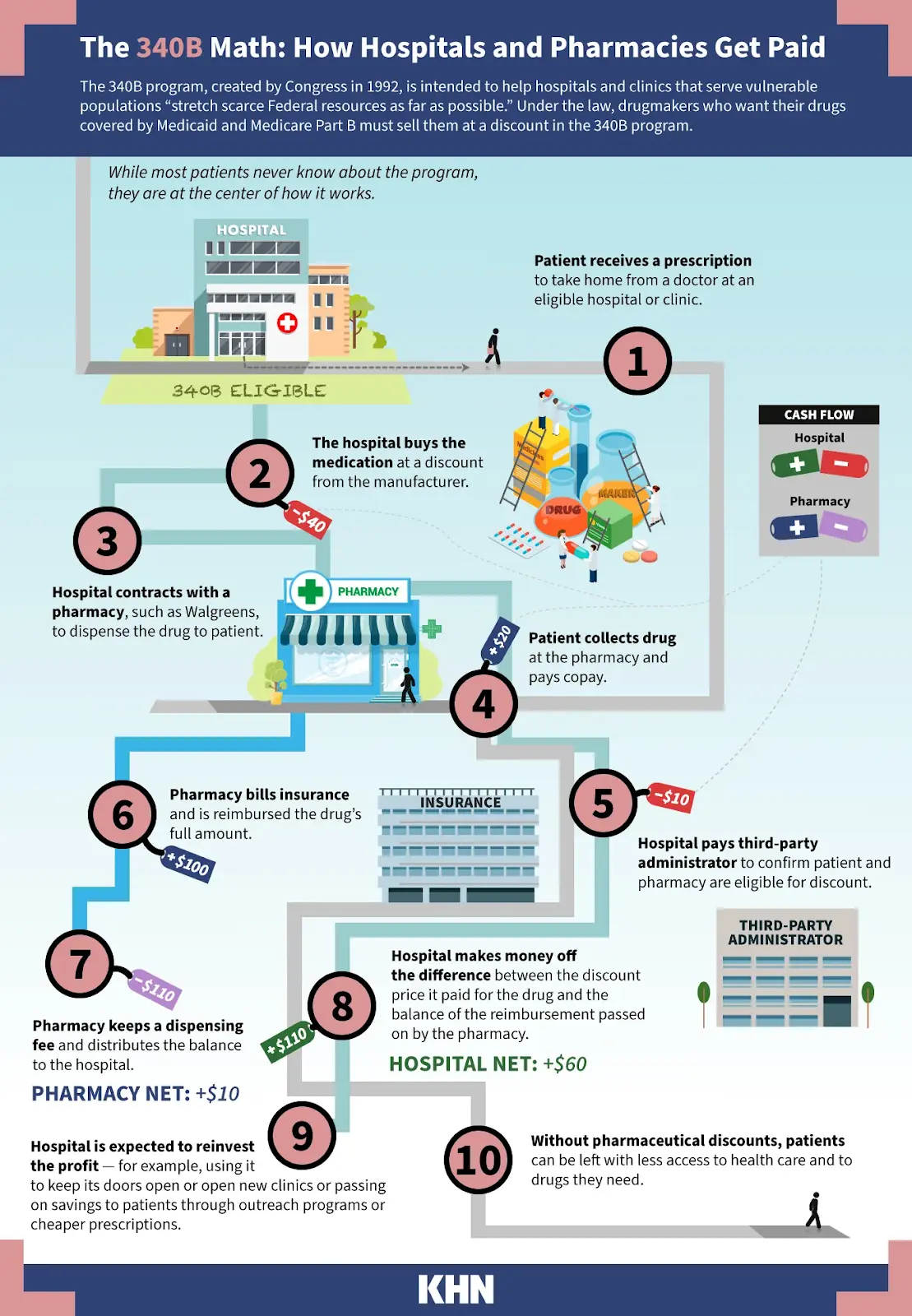 340B is both the valuation of Out-Of-Pocket and also a program whereby drug manufacturers essentially give hospitals a massive discount on the drugs they buy if the hospital sees low-income and uninsured patients. Many hospitals contract with a number of third-party pharmacies (aka. contract pharmacies) to dispense said drugs, and the hospital pays them a fee for doing so.