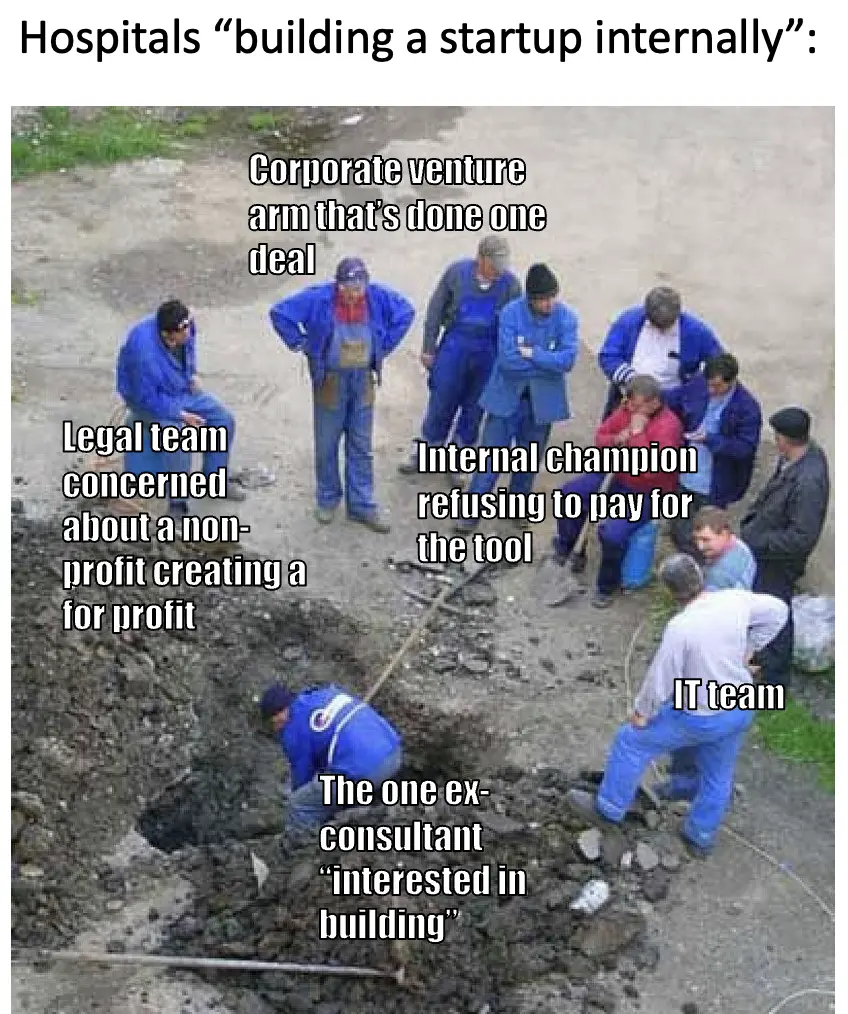 Candidly I don’t think either of these strategies are great ideas, I just think they might happen more next year. I’m sure these hospitals will find partners to build joint ventures with to do some of these things. But it’s just not in their DNA to run these kinds of businesses - they struggle to bring world class talent needed to execute these ideas and are frequently too short-termist from their cash needs to actually play the long game for success in either category. Plus, it’s probably pretty hard to start companies when every $10K+ purchase needs 25 signatures to approve it.