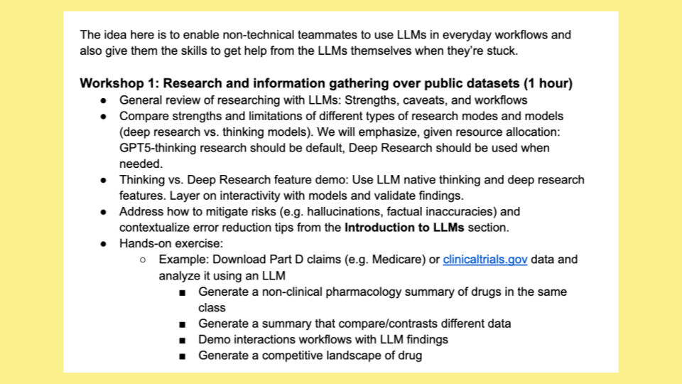 - Hackathon: Pharma Edition - We’re planning an AI hackathon focused on use cases for pharma specifically. Everything from bench science, to lab automation, to post-launch commercialization - what are some interesting ways we can make that process better?