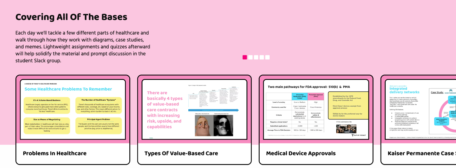 See All Courses →Our Healthcare 101 Learning Summit is in NY 1/29 - 1/30. If you or your team needs to get up to speed on healthcare quickly, you should come to this. We'll teach you everything you need to know about the different players in healthcare, how they make money, rules they need to abide by, etc.