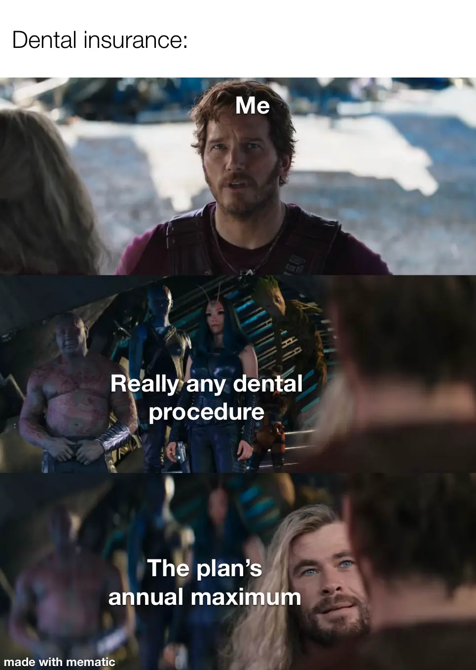 - Dental insurance has plan maximums - This is the maximum amount a plan will cover in a given year and after that, you’re on your own. Theoretically this maximum is to guard against a bunch of elective/cosmetic dental work, which seems like a pretty blunt instrument for that goal. I might be suggesting that prior authorizations would be good here, but I don’t want the dentists reading this to waterboard me in the chair.