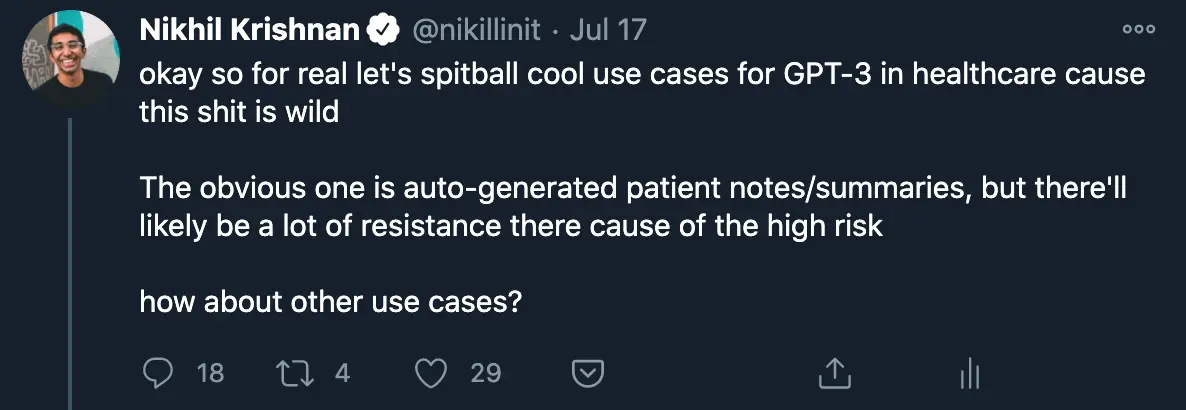 There are probably lots of places this could be applied, like discharge notes for example. Physicians already create “dot phrases”, which are basically commands to autofill text. These are really simplistic, imagine smarter auto-generated ones powered by GPT-3. That would be super powerful