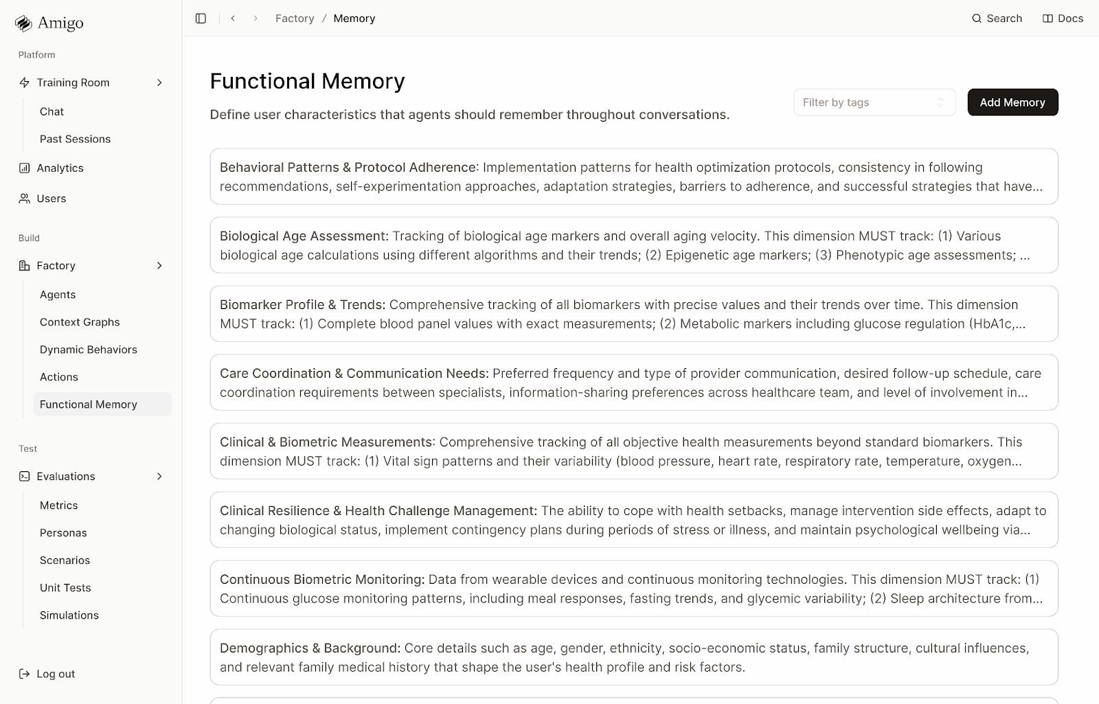 Amigo creates thousands of synthetic patients that mirror the practice's actual population and runs the agent through scenarios: "Patient reports mild nausea after first injection"... "Patient has been vomiting for 3 days and can't keep water down"... "Patient is talking about proteinmaxxing but I have no idea what they’re talking about."