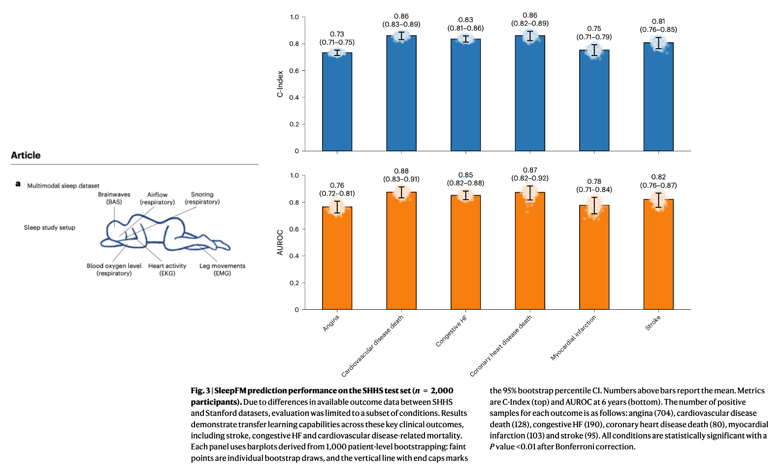 - Easier screening modalities - Can wearables make it easier to screen for diseases than the current standard? The SleepFM paper that came out recently is really interesting. It’s a foundation model trained on 585,000 hours of sleep data from 65,000 participants. From a single night of polysomnography (PSG), it seems to be pretty good at predicting over 130 health conditions (including dementia, heart disease, stroke, etc.). In particular the paper called out being as good as fMRIs at monitoring dementia, despite PSGs being much cheaper and more accessible.