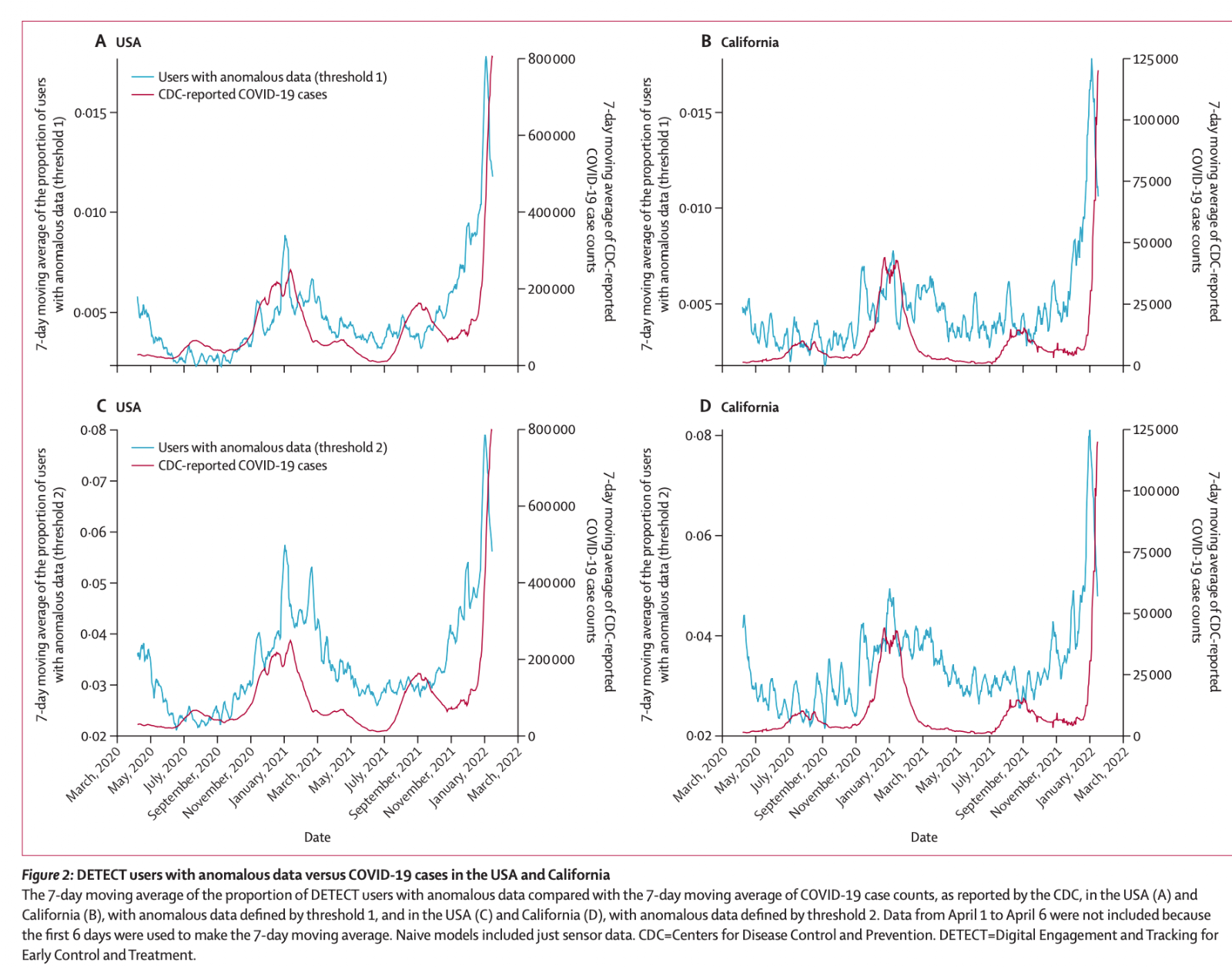 COVID was actually an interesting testing ground for this because it was novel and the episode was short. Multiple studies showed that wearables could detect infections several days before symptoms appeared by detecting deviations from each person's own baseline. A UCSF study using Oura rings could detect COVID an average of 2.75 days before diagnostic testing with 82% sensitivity/64% specificity. The Scripps DETECT study used Apple Watches, Fitbits, and Garmins for individual and population-level outbreak tracking.