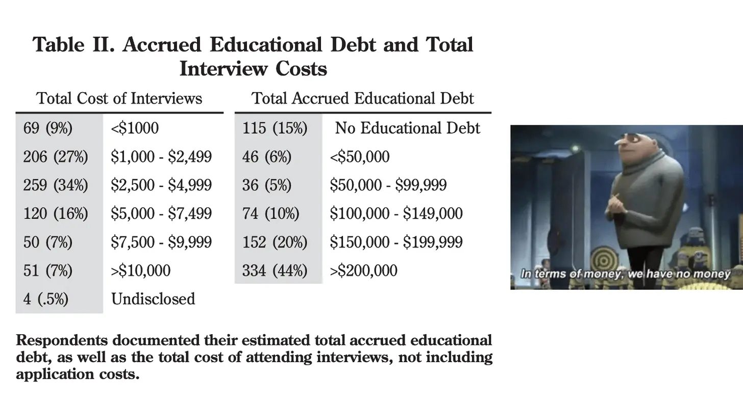 Looking at this study, about 14% spent more than $7500 just to APPLY for residency. 44% of those people had more than $200K in loans. 71% of people in the study borrowed money to fund interviews and 41% declined interviews due to financial reasons.