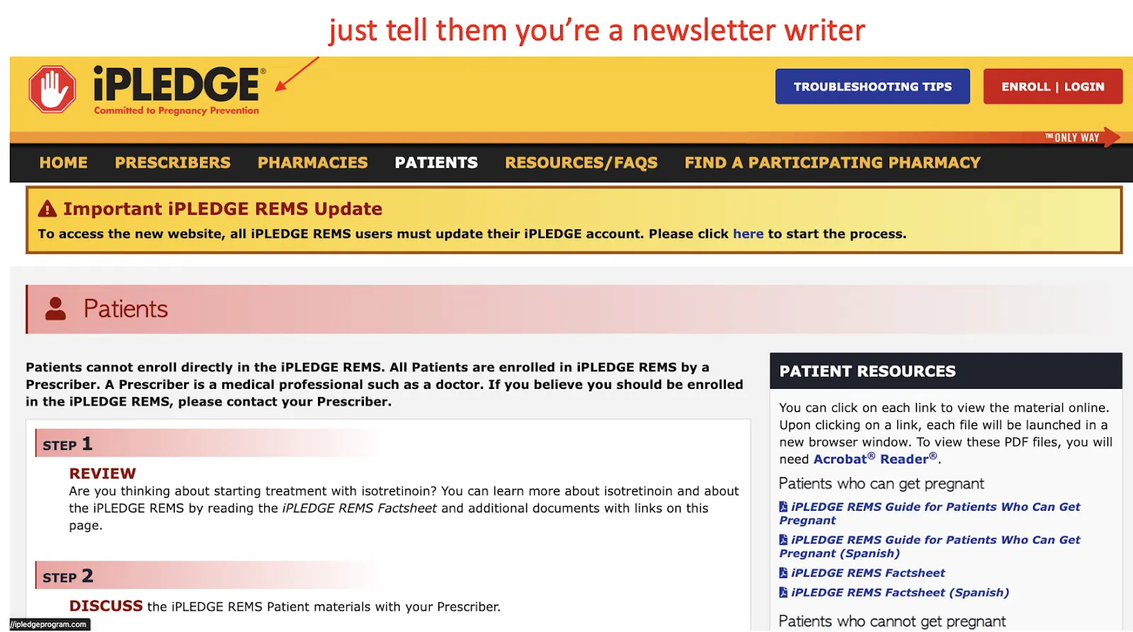 [NK note: Using that iPledge website itself is a serious side effect, jesus. A million people have tried building a new electronic patient reported outcomes tool to no avail. Maybe this is a wedge they should explore.]