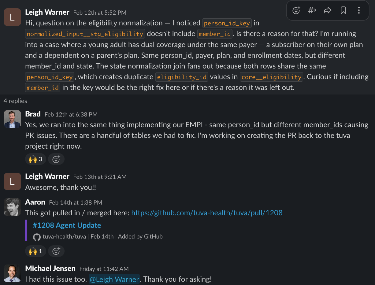 - Tuva Health* has a core product is an open source data model that standardizes messy healthcare data into analytics-ready tables. For example, the demographic data for "Female" might be coded seventeen different ways. It’s not like each company has a unique way of mapping this, so might as well open source it and let people build on each other.