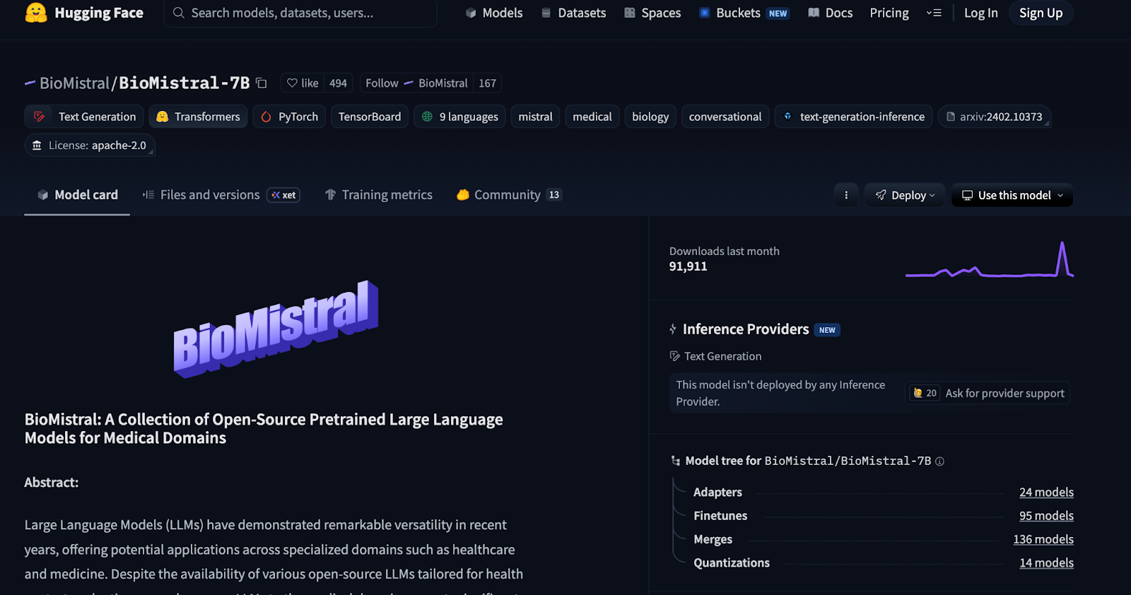 - BioMistral is built on Mistral 7B and fine-tuned specifically on PubMed Central for biomedical text tasks.
