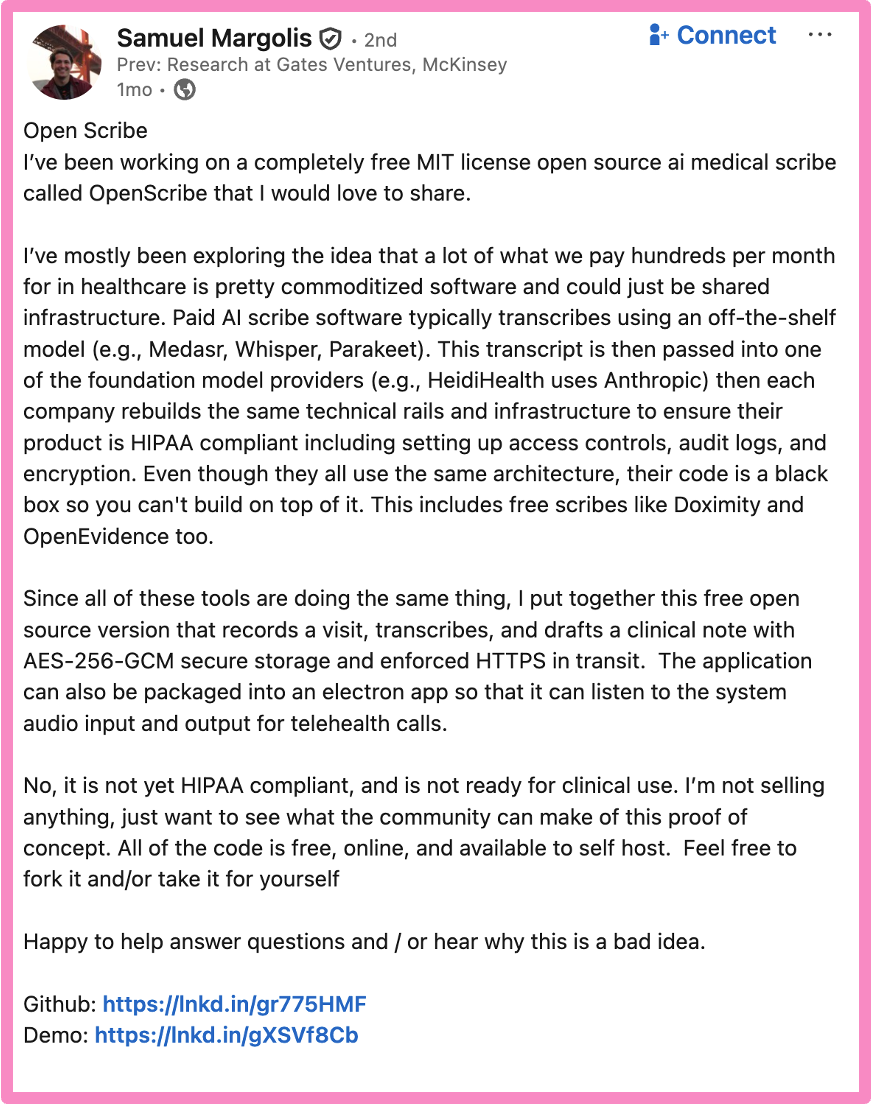 You’re going to see way more people build things in their spare time at work or in their personal lives and open source it. This is partially because it’s a great way to build clout/get eyeballs. But also people are doing it out of sheer disdain for existing vendors lol. In healthcare this is particularly true, because people's hatred for the middlemen is like 100 white hot suns and the products itself are not particularly hard to replicate.