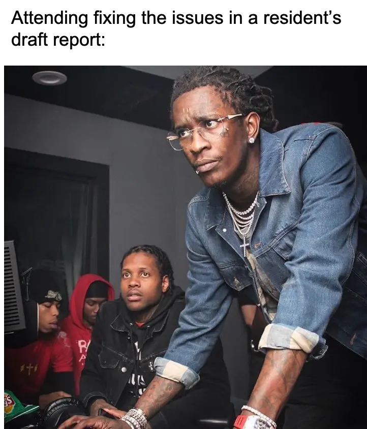 As residents progress, they can also issue "preliminary" reports. Like final reports, these also get sent into the EMR and to the clinicians — though with a "prelim" status. This status is generally understood to mean, "This is probably right but a more experienced person (AKA an attending) will review it and there may be changes." You can imagine how this can be kind of challenging, especially if the prelim report says "no stroke" and the patient gets sent home, but the final report later says "yes stroke". Overnight is when things like this can occur, as that's when there's just residents in the hospital and the attendings don't come in until morning. While this may seem like a major flaw in the system, there is a strong argument to be made that this sort of gradated unsupervised decision-making is a major component of training — and it happens to various degrees in other specialties in a training hospital as well.