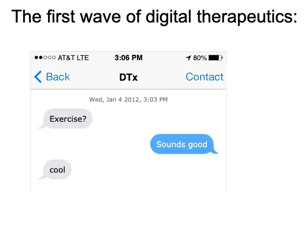 Early on in medical school I took leave for 3 years to co-found a company, Reify Health. We started off building a platform for text message–based clinical research and care. A lot of researchers and doctors had great ideas on how they might induce behavior change or collect data using text messages or other mobile health tools, but lacked the technical chops to do it. We were able to help a ton of projects do some really creative stuff — appointment reminders and high-frequency surveys, sure, but also some automated, super-customized message campaigns which adjusted texting algorithms and/or content based on text responses. We also could pipe in data from things like Fitbit and... Fitbug? (There wasn't too much else back then.) This was circa 2012, so many of our customers' projects were angled to this weird emerging idea of "digital health therapies" or "digital therapeutics" — sign up a patient for a robo-SMS weight loss program and compared to normal weight loss clinic, they lost more weight!