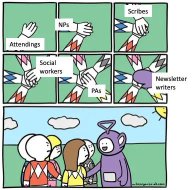 Of course, as with any group of people working closely together under pressure with distinct and challenging roles, there is often tension. Sometimes that's the nature of the work: the patient is coding and the nurse can't reach the doctor; the team asked the social worker to do something which he then forgot about, delaying discharge, etc. Situations are hard and people aren't perfect. Often you want things to be more collaborative, but the structure of things means that the doctor is the ultimate decision-maker and arbiter, even for small, seemingly silly things, and the dynamic is hard to get out of.