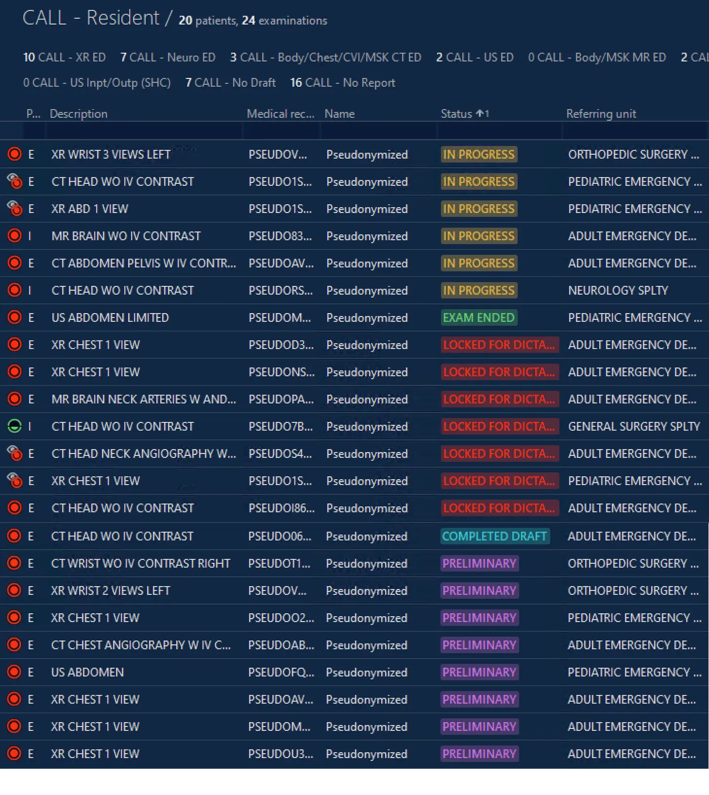 The radiology technicians and nurses then do the actual work of getting the scan done: positioning, making sure the images are satisfactory, etc. Images come to us through the PACS (picture archiving and communication system) usually as part of a worklist, which is our queue of exams to review.