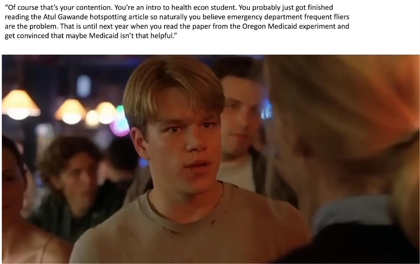- It’s pretty easy to find studies that show the opposite conclusion of most of these studies, so you can’t really make too many generalizations on just a single study. This is most clear with the Oregon Medicaid papers, where different ways of slicing the data will show what you want to find, especially when there’s political motivation.