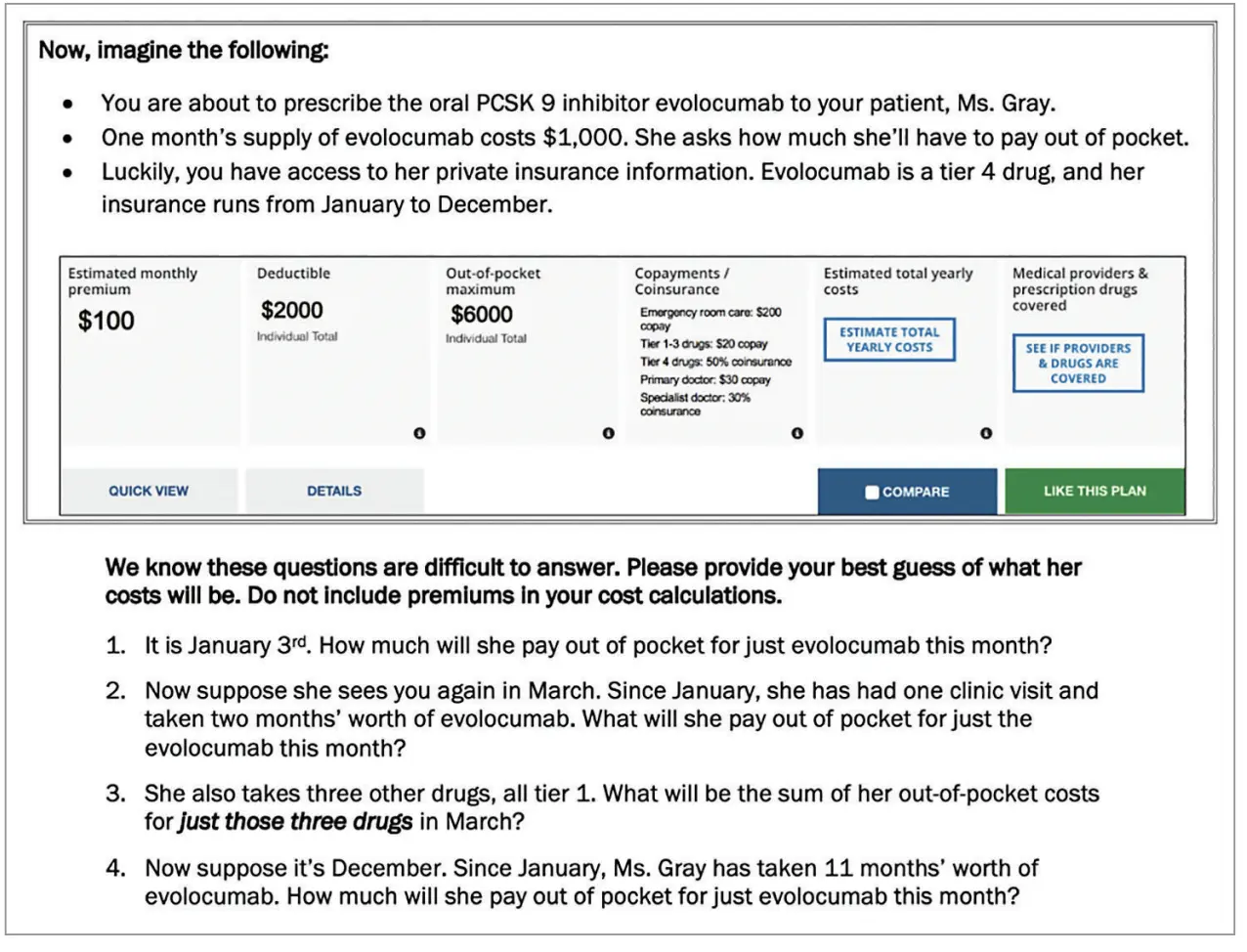 After that, they’re given a vignette about a patient where they need to guess how much a patient would pay if you prescribed a $1,000 drug using the patient’s insurance information they have readily available (already a fantasy scenario).
