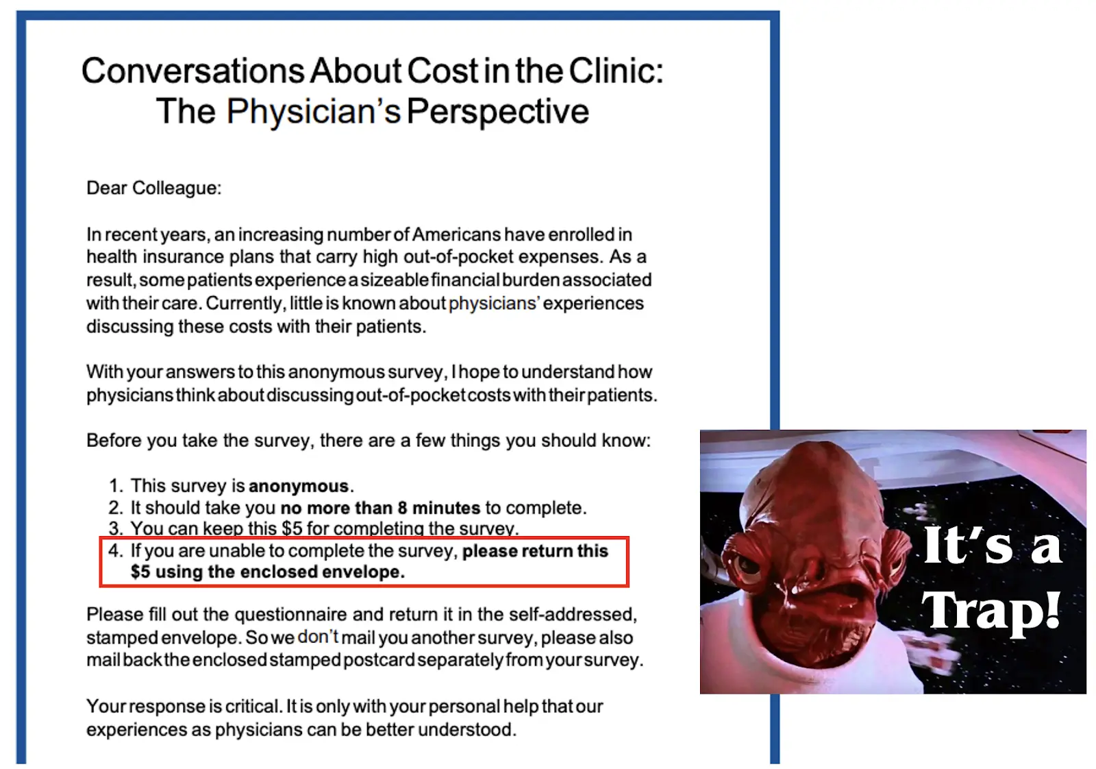 First of all, let’s look at the methods. They sent doctors an envelope with…$5 lmao. But even better is that the letter said to fill out this survey otherwise…mail back the $5…