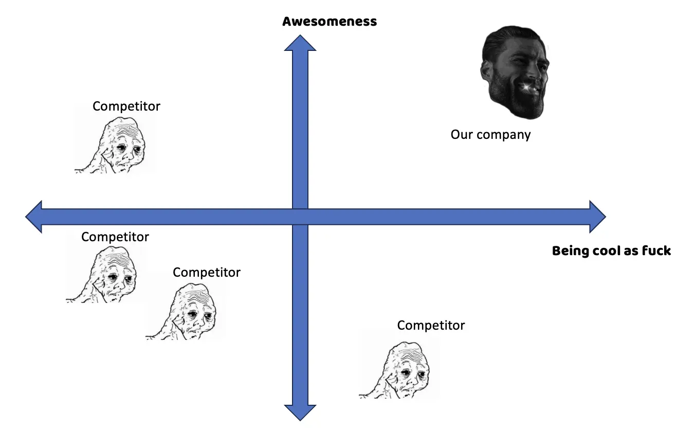 We don’t know who developed the whole “two axes and my company is in the top right” framework but we wish them poorly. This slide very rarely communicates much and honestly can actually detract your pitch. If one of your axes is “customer empathy” then we’re actually worried that you don’t have other defensible qualities to the business.