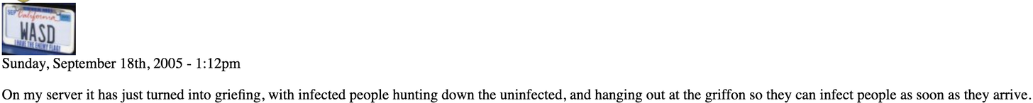 Now you have a recipe for a real pandemic that spread from an animal to a human in the countryside and into a major metropolitan city. Remember, this spell was designed for higher level players, and now was in the regular city with the lower levels. There was an absolute bloodbath.