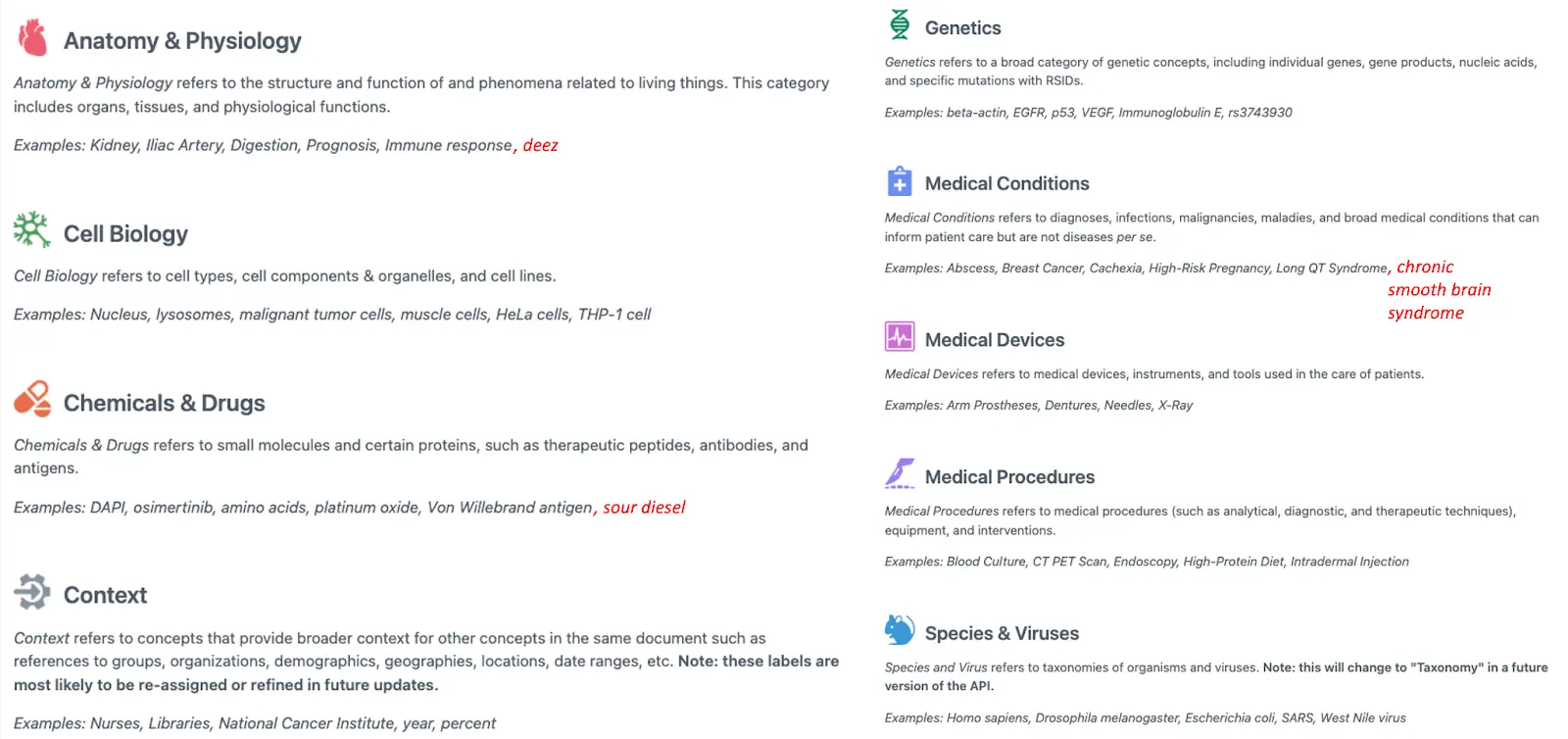 More seriously, the model identifies key terms, the context in which they’re being referred, and then maps those terms to different concepts, which you can see below. It can ingest this data as straight text or can identify and extract elements from PDFs as well.