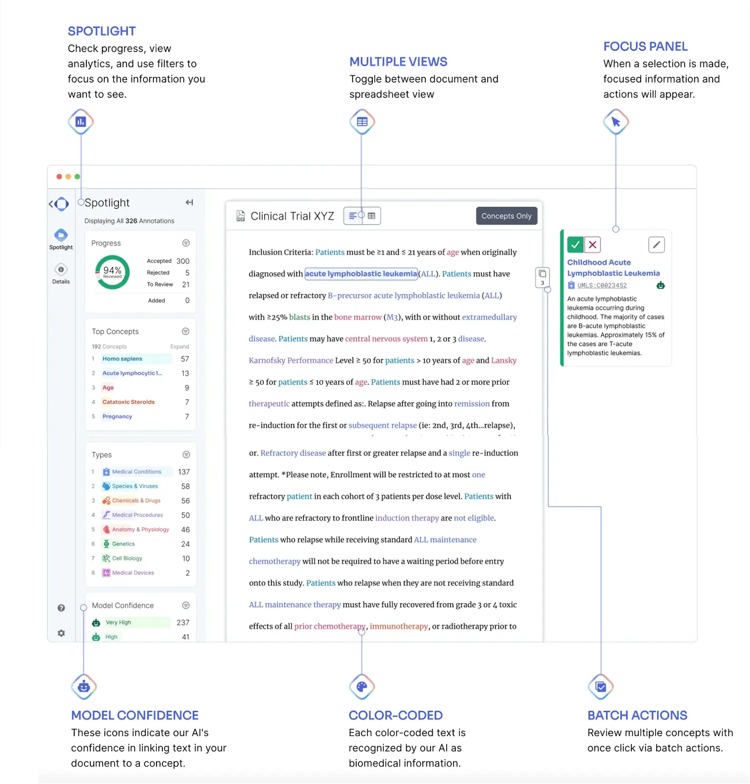 The model is designed to fit into existing workflows where NLP would be useful. The API can be used right out of the box, and it’ll distinguish when it has higher and lower confidence in its suggestions. A separate product called Annotate lets customers overlay the model onto the document and see the different concepts highlighted as well as the confidence score of how that term is getting mapped. Annotate has several workflow tools that can speed up data abstraction like being able to filter by a concept (e.g. medication) and batch annotate concepts that come up several times in a document.