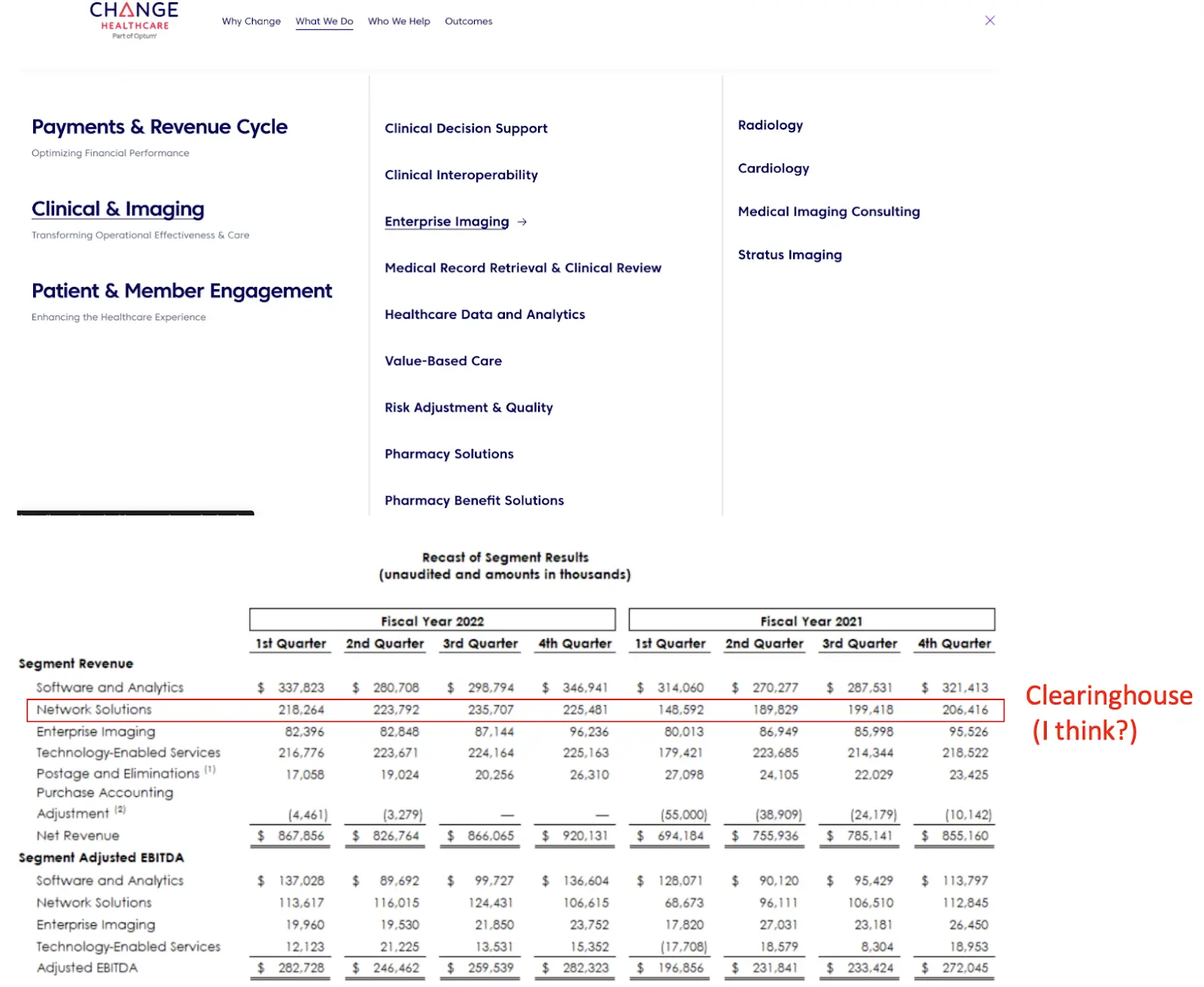 This data powers different non-clearinghouse products like fraud waste & abuse, de-identified data sales, clinical decision support tools, and more. These products become better with access to more data, and it’s a big part of the sell to payers for why they should let Change handle everything from end-to-end. In fact, it seems like the non-clearinghouse functions are a much higher revenue area for Change, though the clearinghouse is a better margin business.