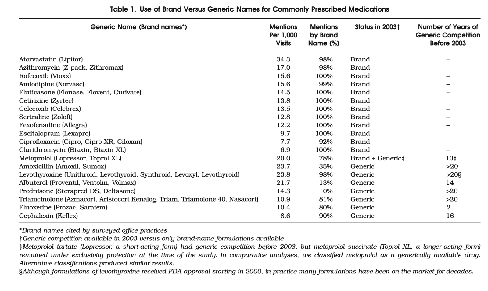 Let's think about pharma here, where I would see the most obvious conflict of interest. There's already pretty good data that shows physicians predominantly use brand names instead of generic names for drugs, even if there are generic formulations available. One study cited this at 98% for the top 20 medications prescribed. This was a bit of an older study (2007), but the point is that physicians have been influenced by the pharmaceutical industry en masse to the point where the medication is not even referred to by the clinical name, rather the brand name.
