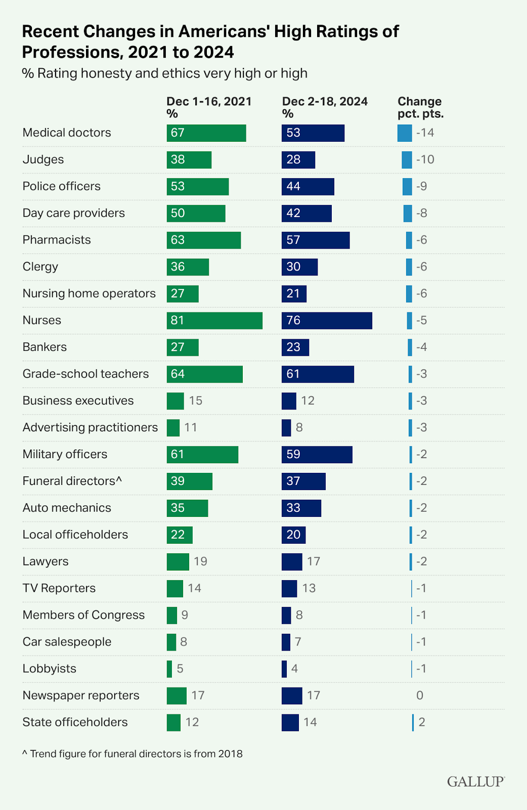 [NK note: I agree with this largely. But can someone tell me what…would increase trust in doctors at this point? It seems like anything docs do now lowers trust with the public. A doc could save a baby from a burning building and there would be a viral tweet about how the doc probably started the fire.