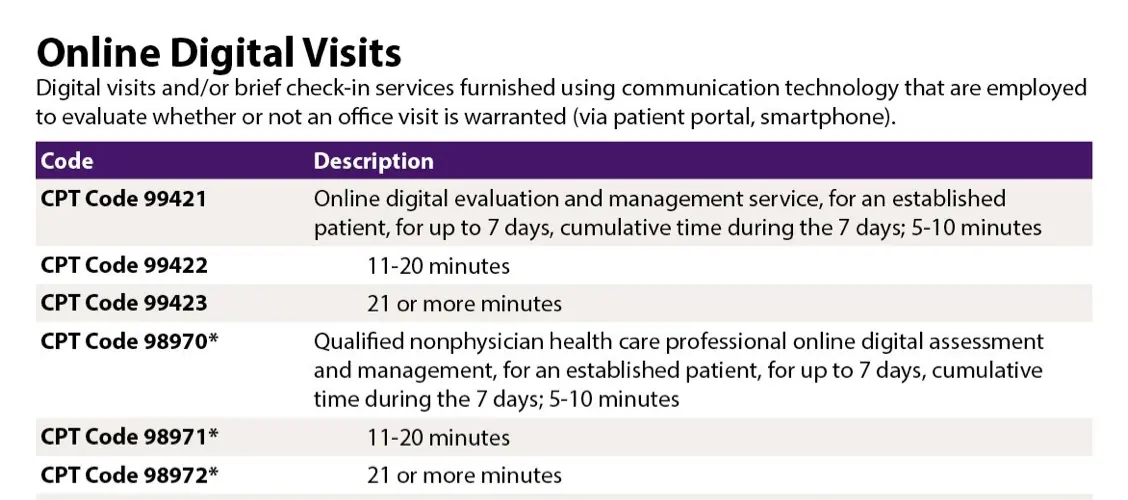 Here are some examples for “online digital visits”, which seems like a redundant phrase but whatever I’m not the name police. Many of the CPT codes will be different depending on whether or not the patient is new, how much time was spent with the patient, if you want to commit fraud, etc. There are more than 10,000 different CPT codes.