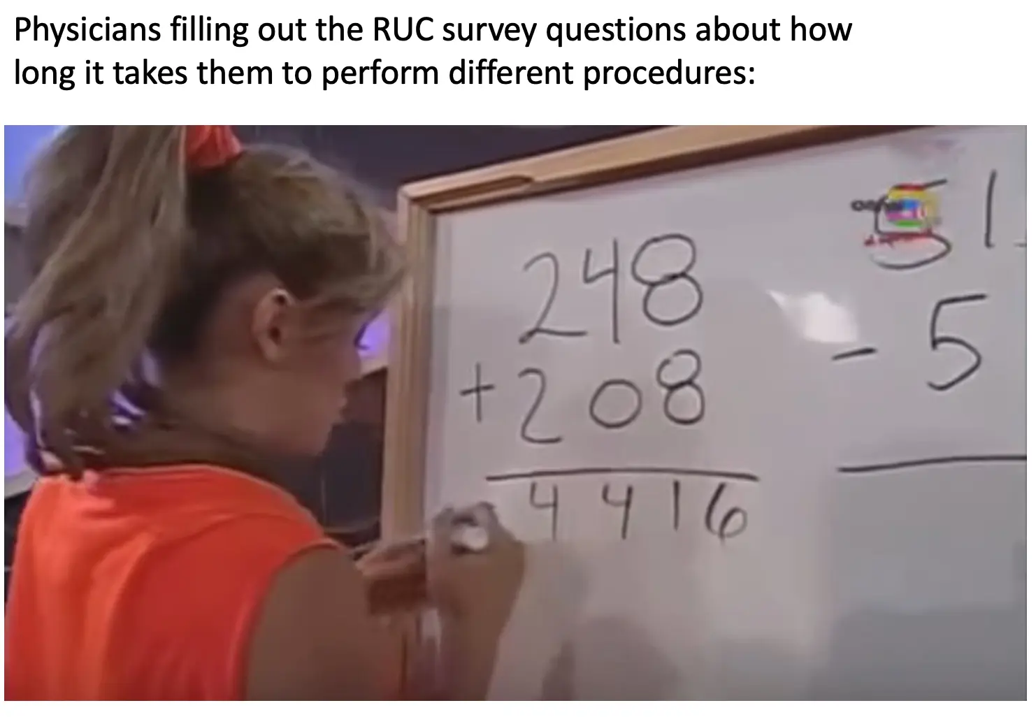 Finally, physicians who do the survey are obviously incentivized to say these procedures take an extremely long time (since it results in how they get paid). There are several different studies (here, here, and here) that all show pretty large discrepancies in how much the physicians report something takes in minutes on the surveys vs how long it actually takes based on real-world data. Of course!