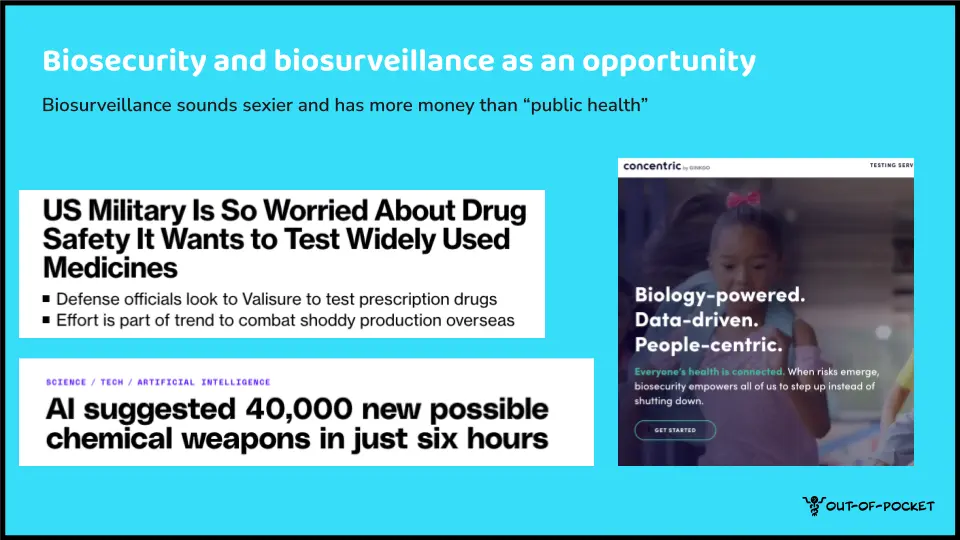There’s a more targeted national effort in how this relates to domestic security that will create new company opportunities. The DoD released a biomanufacturing strategy that strongly pushes to do more domestically. And I’m sure as public health dollars start dwindling post-COVID, we’ll start seeing companies initially being used to monitor COVID outbreaks start eyeing some of these biosurveillance and biosecurity initiatives that are likely much more lucrative.