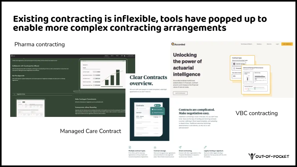 Contracting isn’t just within healthcare, but now interfaces with the regular world as well. This is especially true in areas like Medicare Advantage where health plans need to pay home improvement vendors, food vendors, etc. that fall under supplemental benefits. Companies are popping up to not only create default contracts and payment rails, but also making sure that vendors and people getting paid are falling under compliance with the health plan rules.