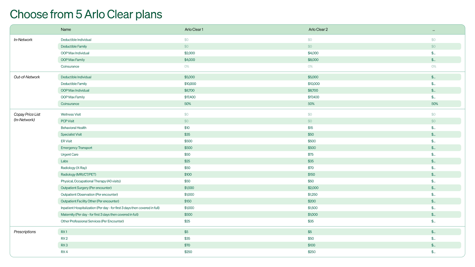 Arlo runs a level-funding plan for small businesses. Then they offer the employer a few different plans. All of their plans share the same core designs for patients: