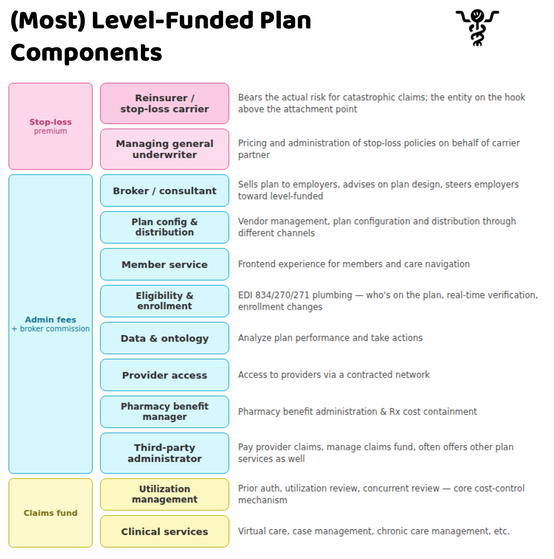 3. Vendor and admin fees - This is for all the stuff that makes the plan actually run: the third-party administrator that processes claims, the pharmacy benefits manager that handles prescriptions and drug coverage, the network, the decorative provider directory, care navigation, etc.